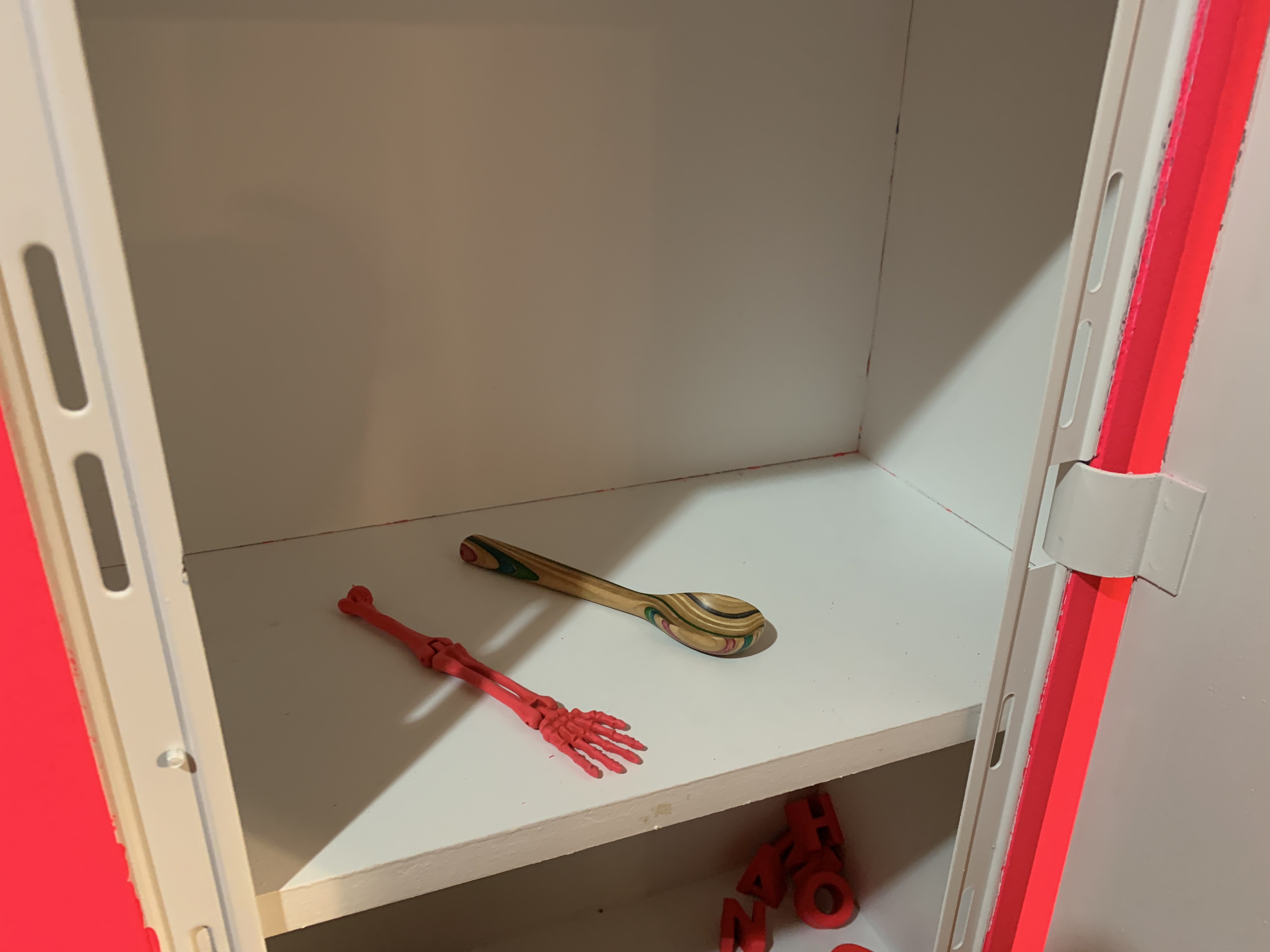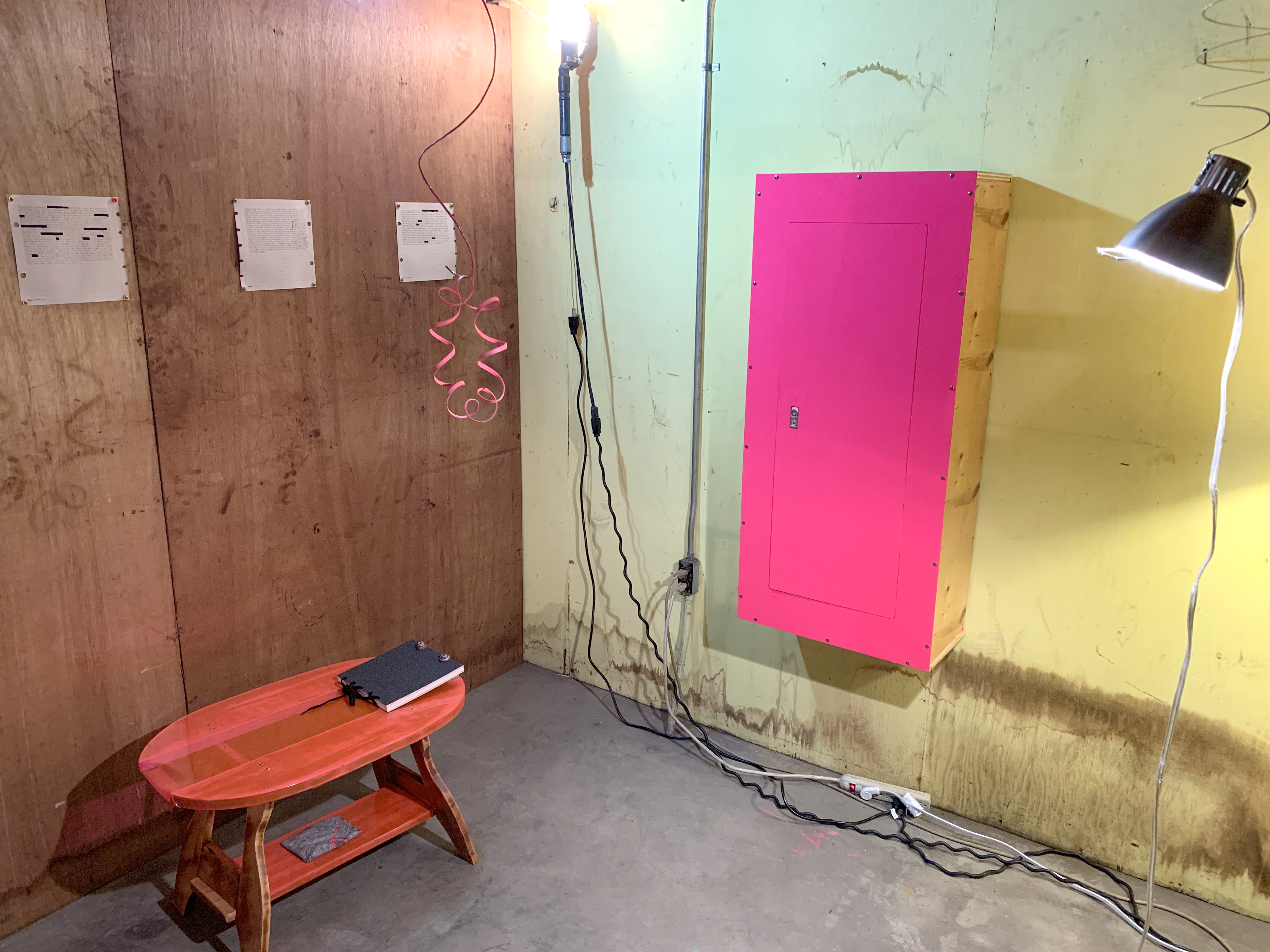 Pink is an energetic color it grabs the eye and draws it in. It can be polarizing, people often have very specific associations with it around identity or culture. I became drawn to the color as I began to explore my own identity further and discovered that I was uncomfortable with the color. I challenged myself to overcome my uncertainty about the color and began using it as a way to signal my hand in making. This cabinet was made using pink pigmented wood glue to highlight its imperfections and is embellished with self deprecating comments pointing out mistakes made in the making process.
